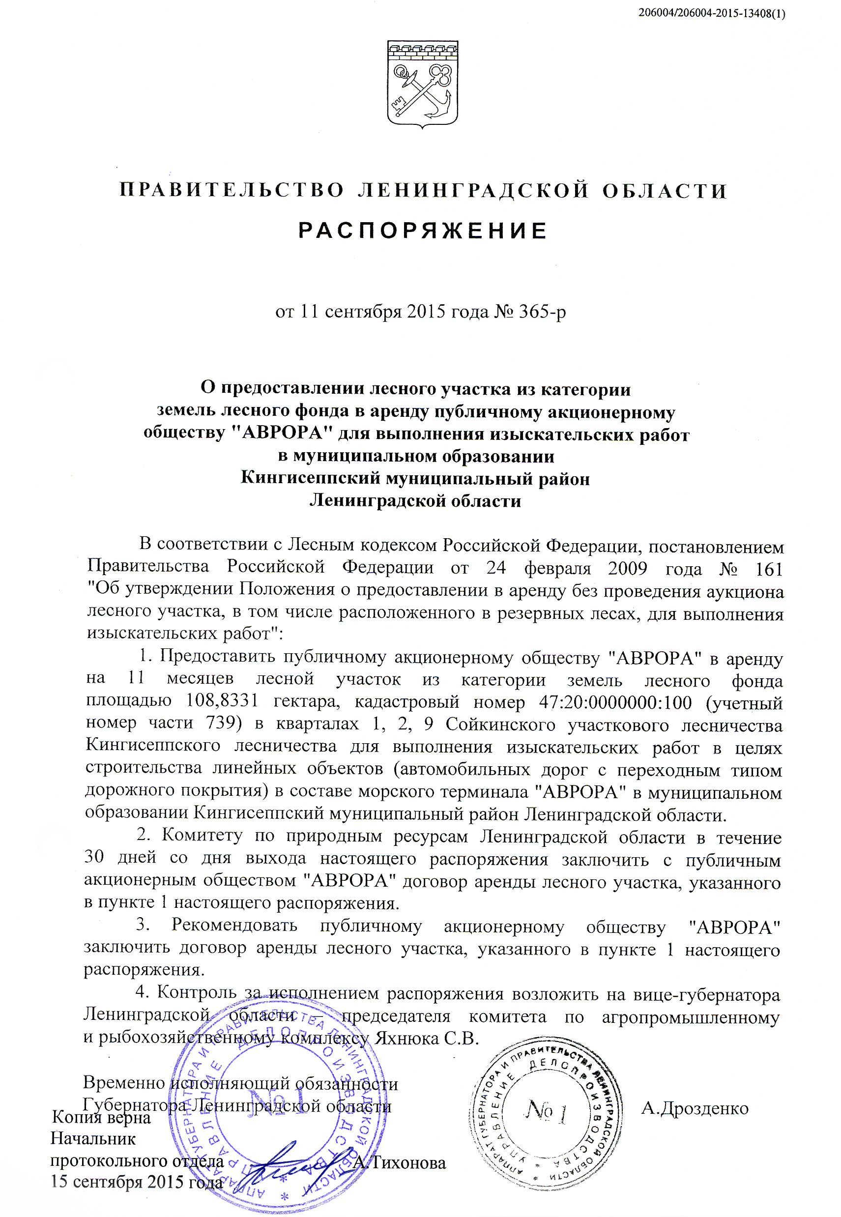 Распоряжение Правительства Ленинградской области № 365-р (108,8331 га)