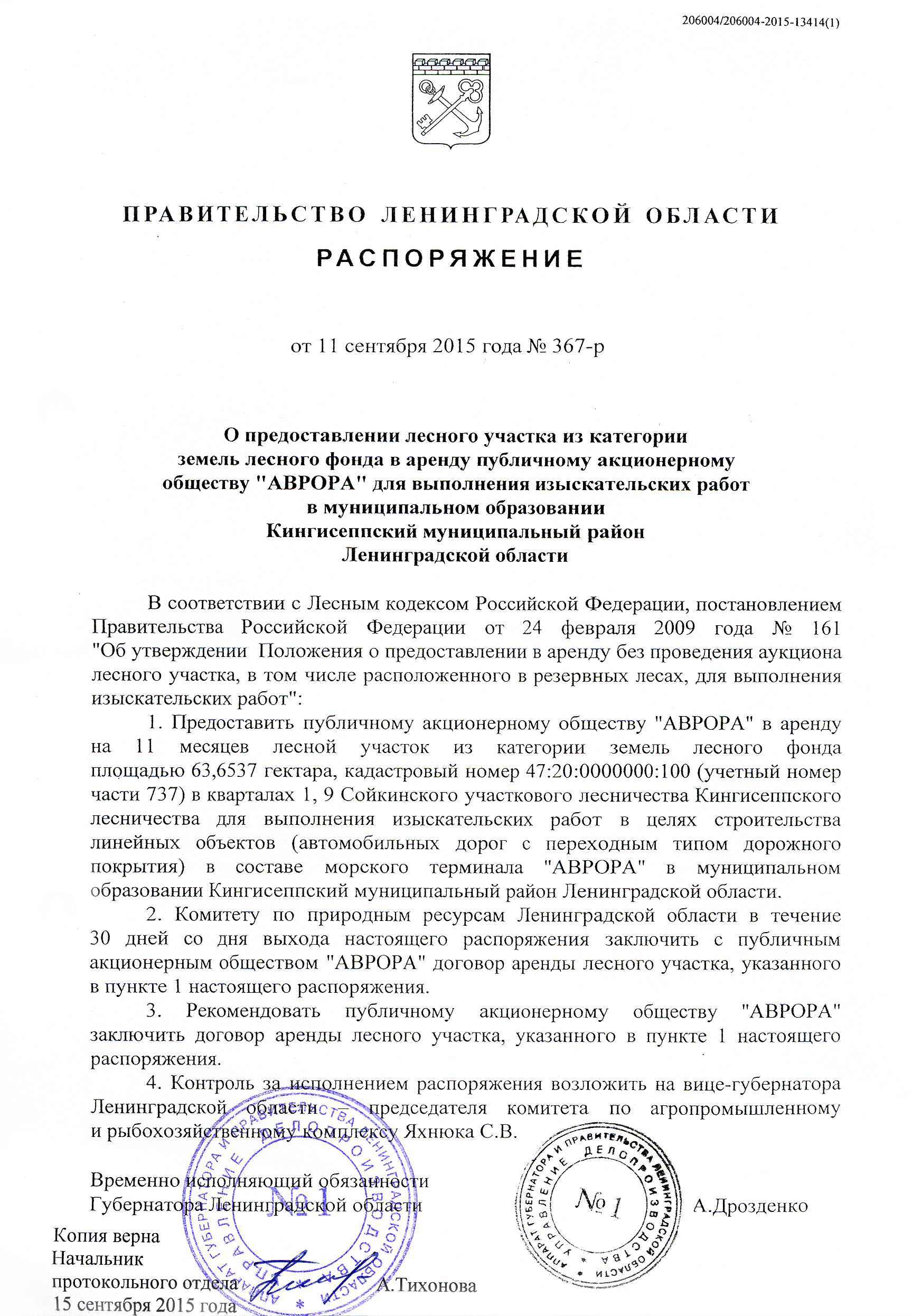 Распоряжение Правительства Ленинградской области № 367-р (63,6537 га)